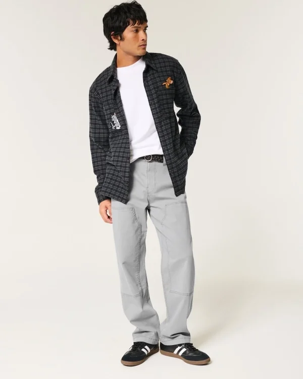 Ultra-comfortable twill pants with utility-style reinforced knee stitching, a loop at the left leg and extra pockets. Baggy leg.