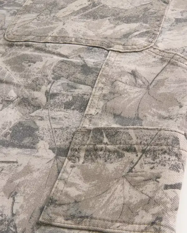 Comfortable painter-style denim skater jeans designed with a baggy leg, left loop detail and extra pockets. All-over camo pattern.