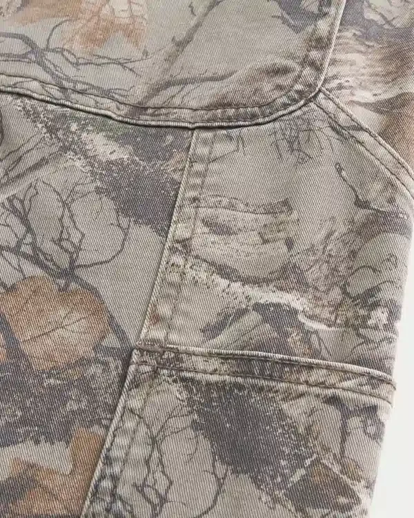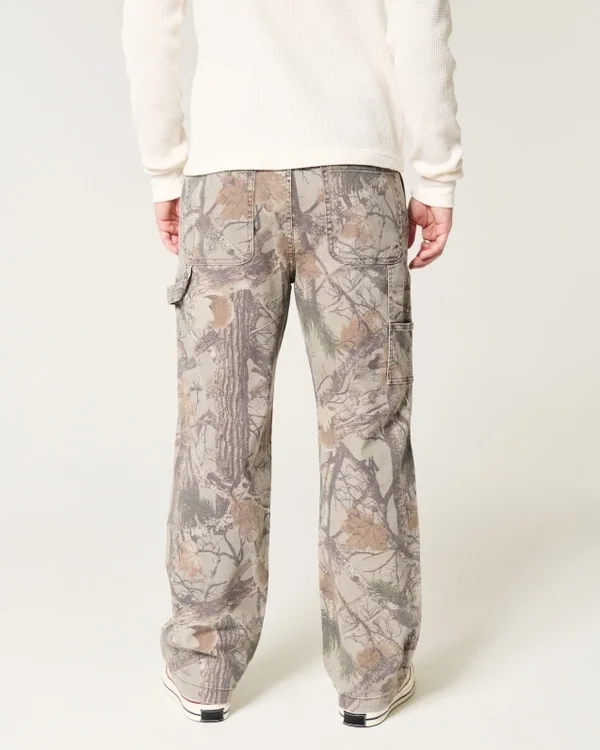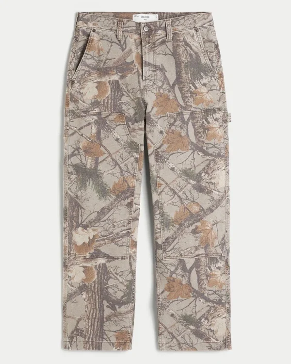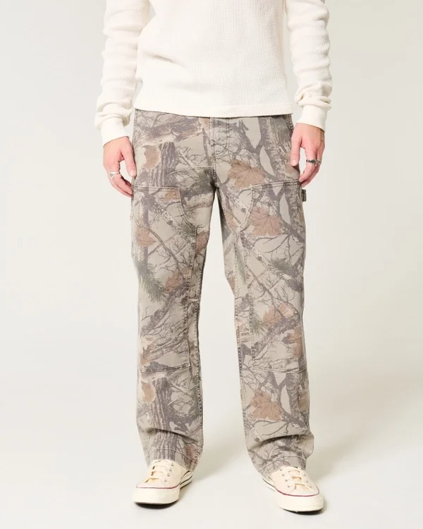 Comfortable twill carpenter pants designed with a baggy leg. Reinforced knee stitching, left loop detail, extra pockets, all-over camo pattern.