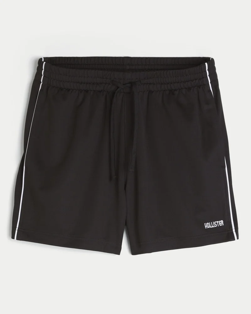 Super soft knit soccer shorts with a drawstring waist and embroidered logo detail at the left hem. Pockets, mid-thigh length.