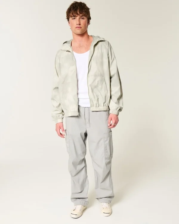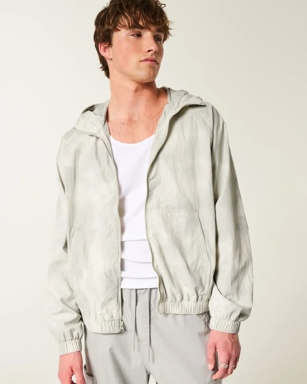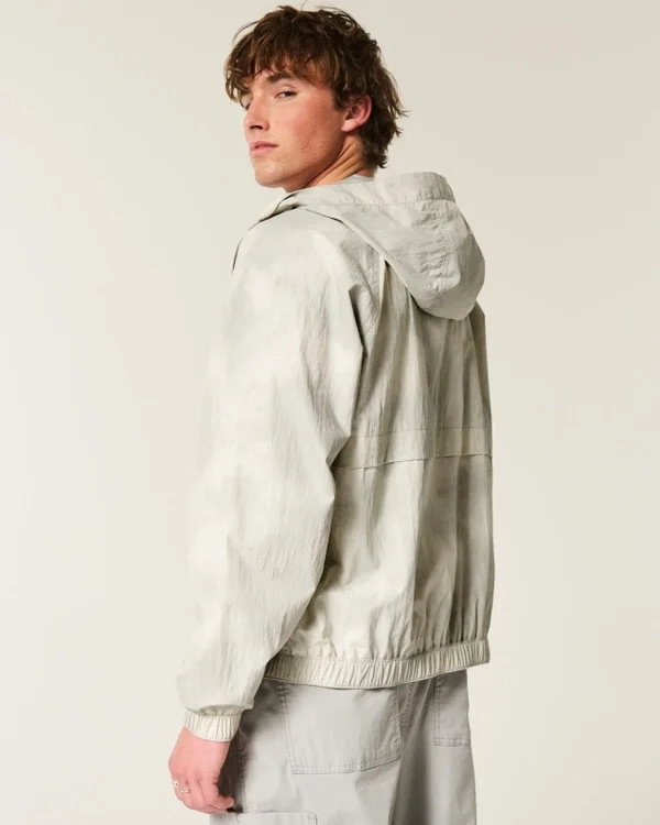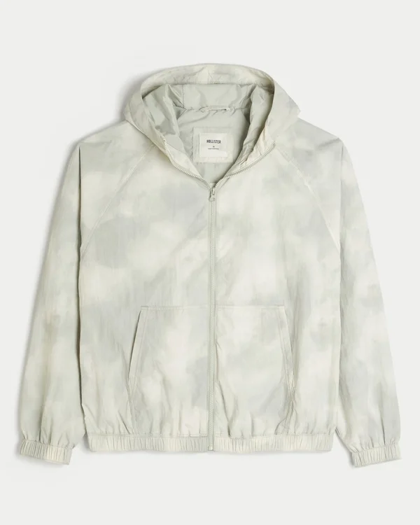 A classic windbreaker jacket with a full zip-up closure and all-over camo pattern. Front pockets, hood.