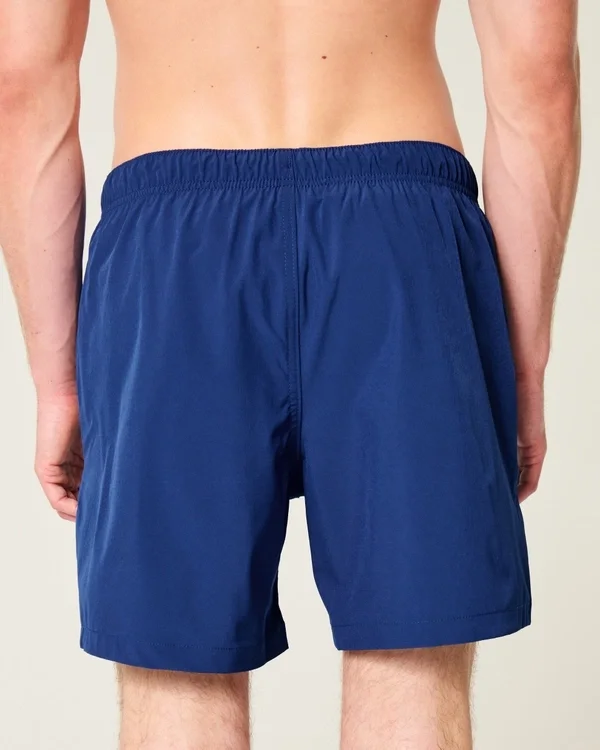 Shorter-length swim trunks that hit mid-thigh. Featuring comfortable 4-way stretch swim fabric and a 6" inseam. Pockets, drawstring waist, embroidered Huntington Beach graphic