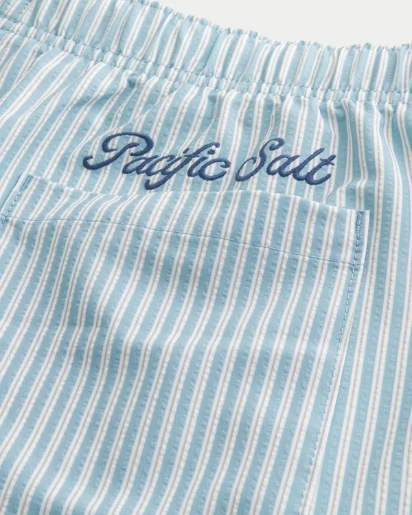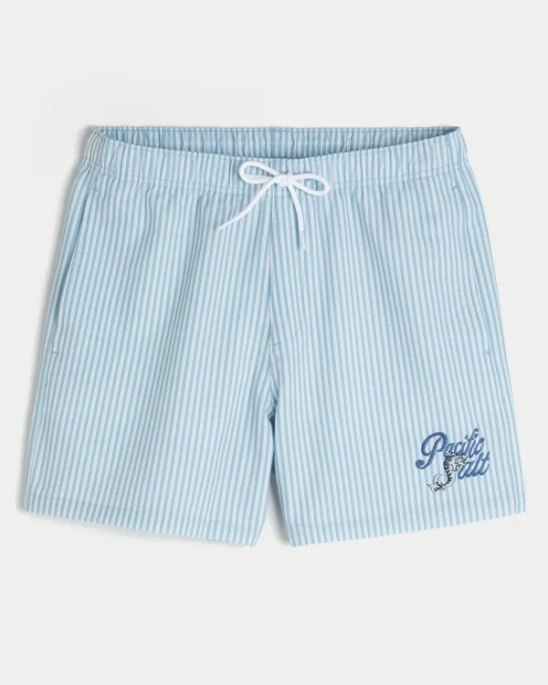 Shorter-length swim trunks that hit mid-thigh. Featuring comfortable 4-way stretch seersucker swim fabric and a 5.5" inseam. Front pockets, mesh lining.