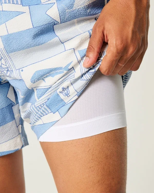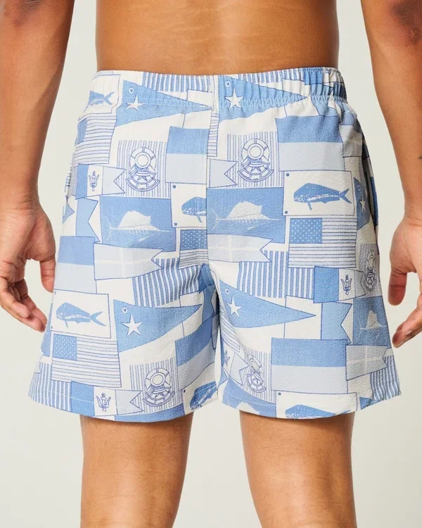 Shorter-length swim trunks that hit mid-thigh. Featuring comfortable 4-way stretch seersucker swim fabric and a 6" inseam. Front pockets, mesh lining. Imported.