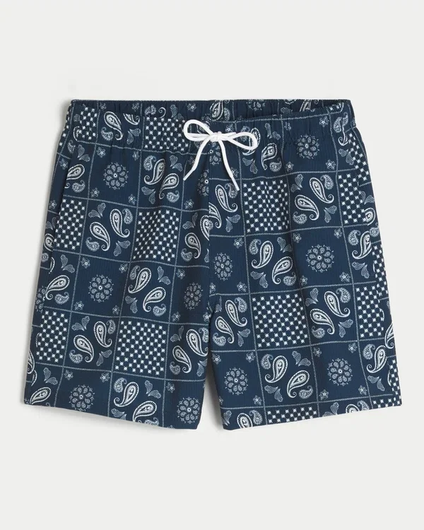 Shorter-length swim trunks that hit mid-thigh. Featuring comfortable 4-way stretch seersucker swim fabric and a 6" inseam. Front pockets, mesh lining.
