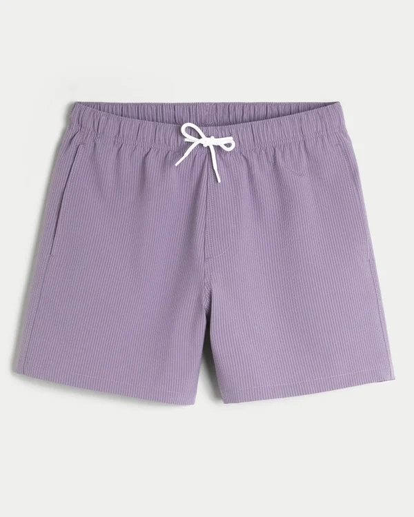 Shorter-length swim trunks that hit mid-thigh. Featuring comfortable 4-way stretch seersucker swim fabric and a 6" inseam. Front pockets, mesh lining.