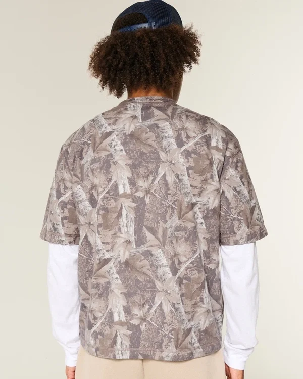A super soft, heavyweight 100% cotton t-shirt with a crew neckline and short sleeves. All-over camo pattern. Boxy Crop Fit.