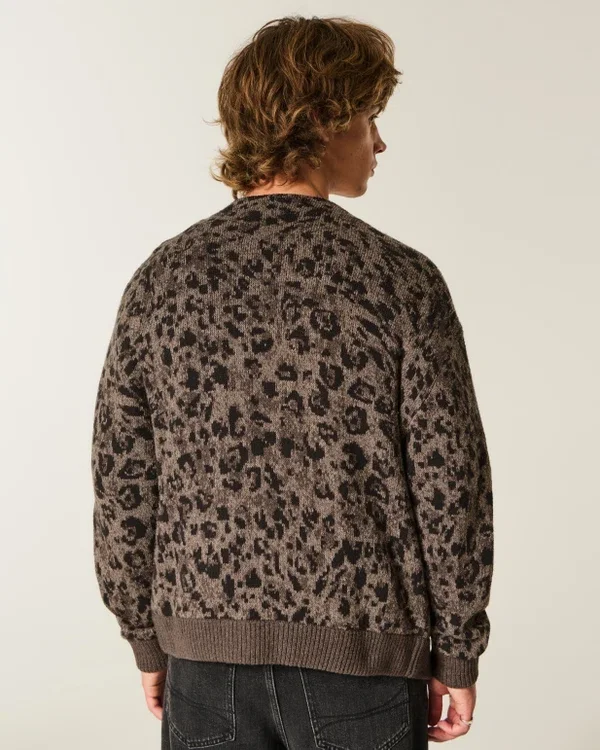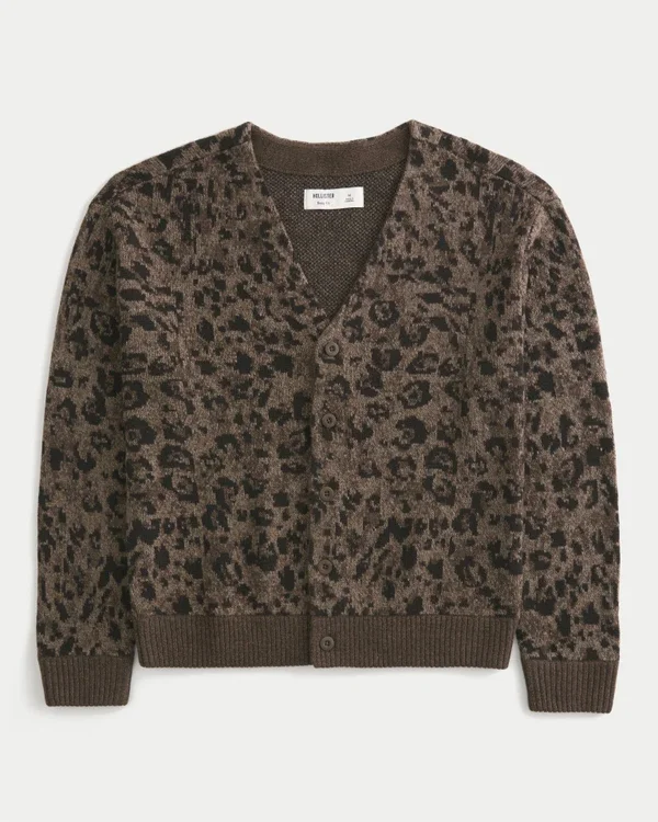A super soft and comfortable cardigan with a v-neckline and button closure. Ribbed trims, long sleeves, all-over leopard pattern. Boxy Fit.