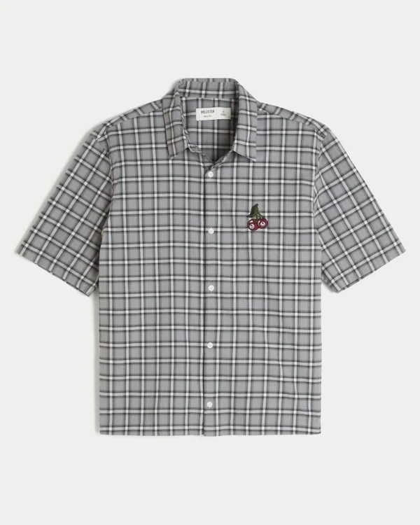 A classic short-sleeve shirt with an embroidered cherry graphic at the left chest. Collar, short sleeves, full button closure. Boxy Fit.