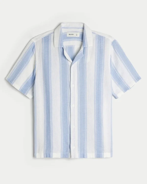 A classic button-through shirt in soft textural fabric with stripes. Collar, short sleeves, left chest pocket.