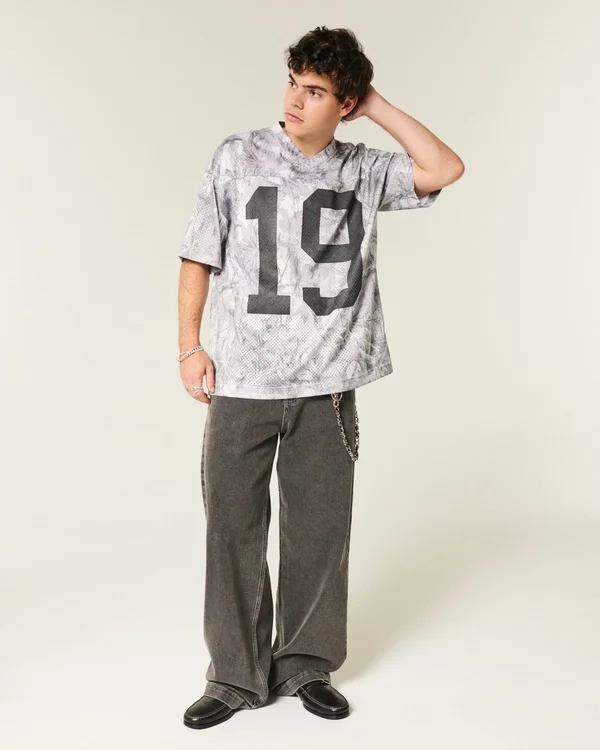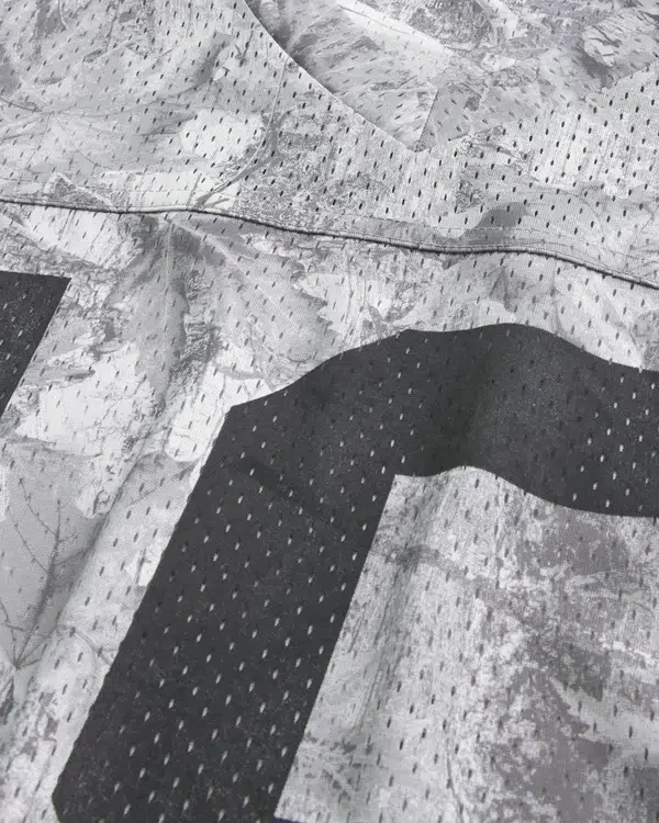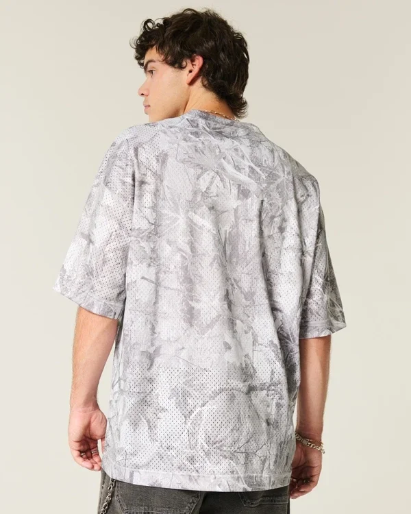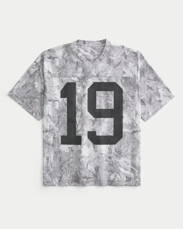 This classic football jersey features an all-over camo pattern and number print graphic. V-neckline, short sleeves, soft mesh fabric. Baggy Fit.