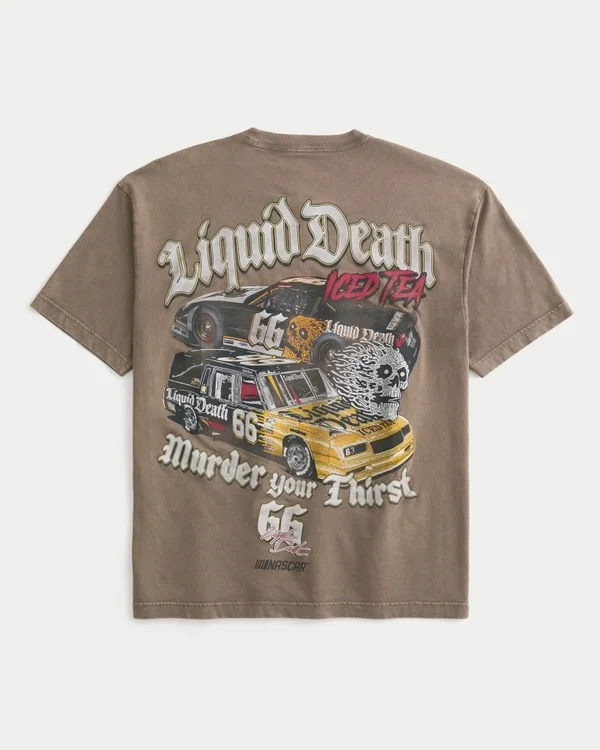 A super soft 100% cotton tee official licensed NASCAR Liquid Death print graphics at the left chest and back. Crew neckline, short sleeves. Boxy Fit.