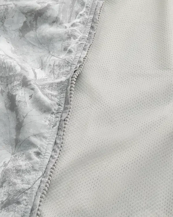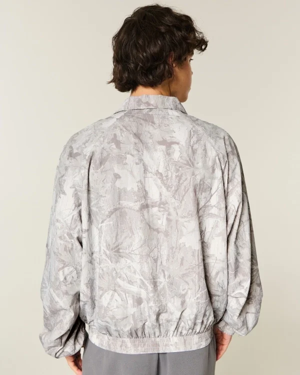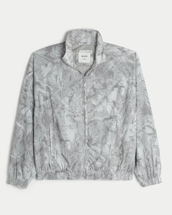 A classic windbreaker jacket with a full zip-up closure and all-over camo pattern. Front pockets, banded hems.