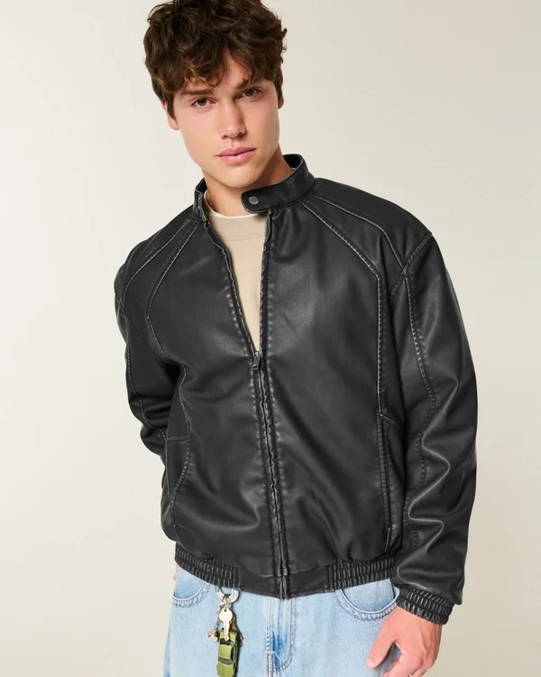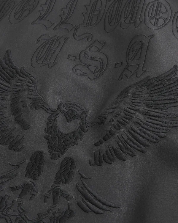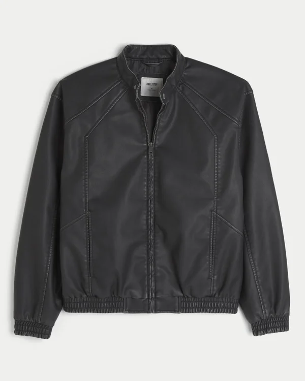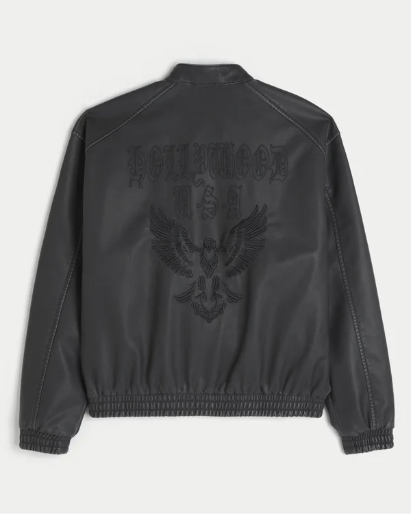 Made with faux leather, this jacket features embossed Hollywood USA graphics at the back and a full zip-up closure. Banded hems, pockets, snap collar.