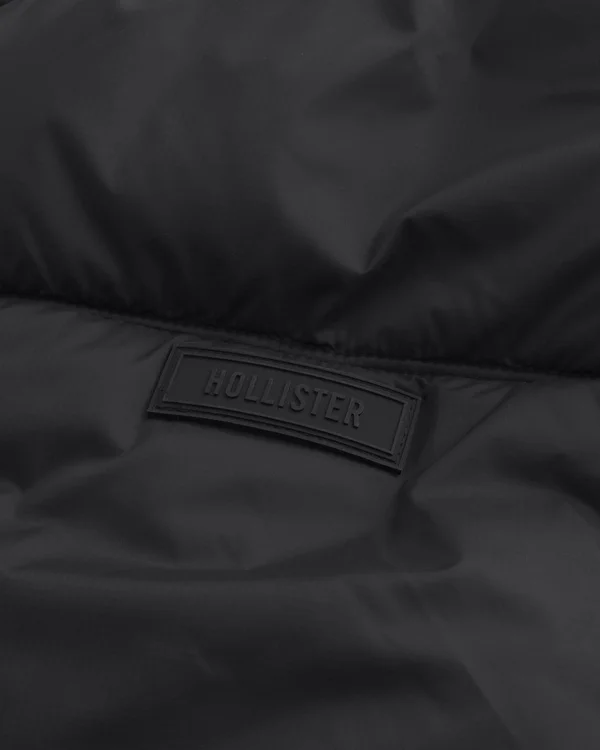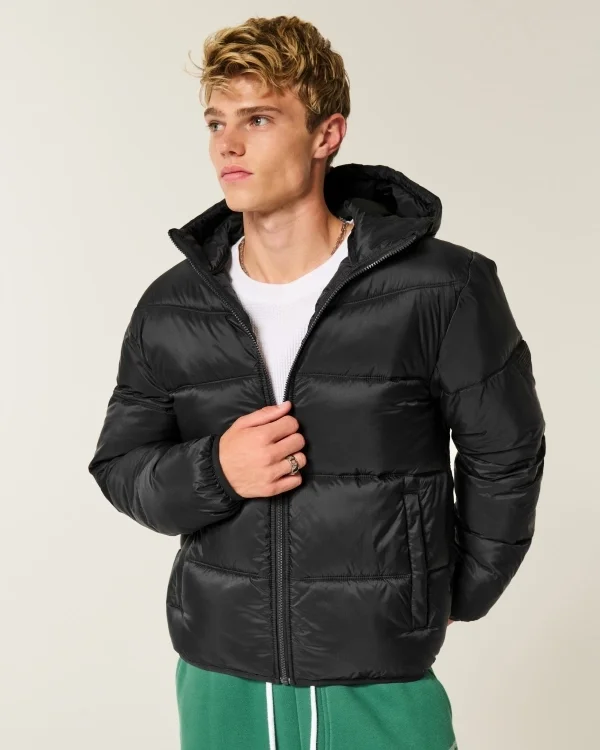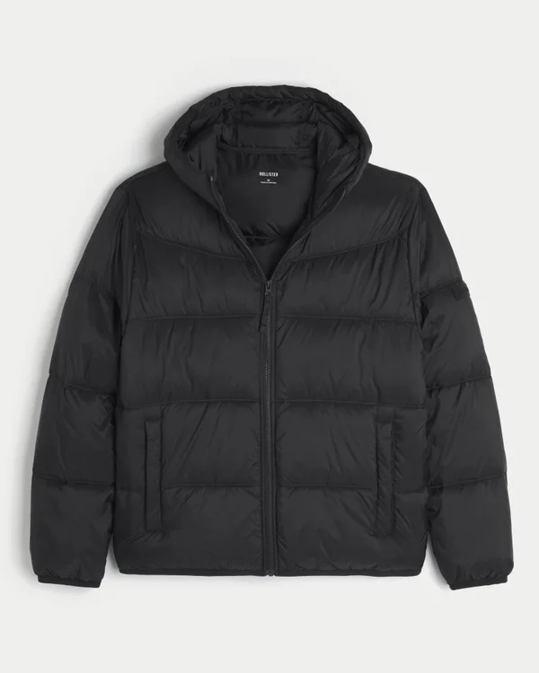 A comfortable, unlined puffer jacket designed with quilted channels. Full zip-up closure, front pockets, logo detail at left sleeve, hood.