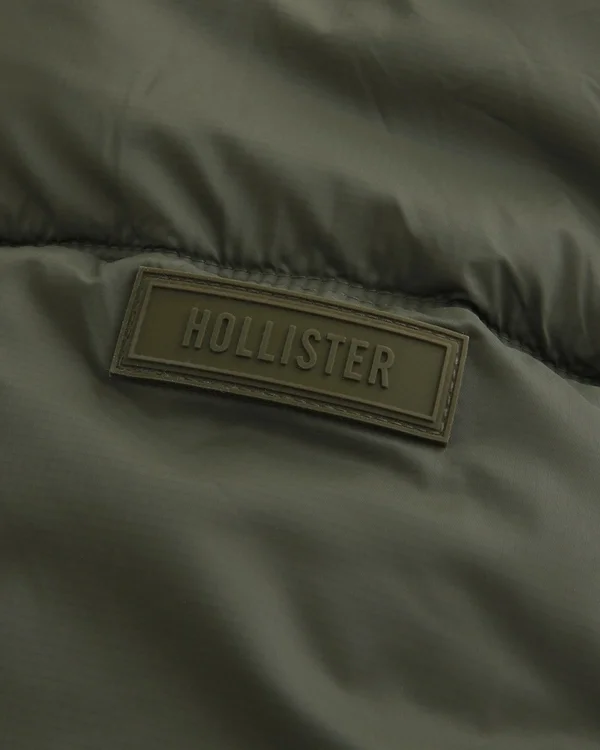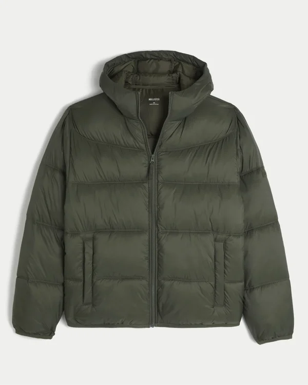 A comfortable, unlined puffer jacket designed with quilted channels. Full zip-up closure, front pockets, logo detail at left sleeve, hood.