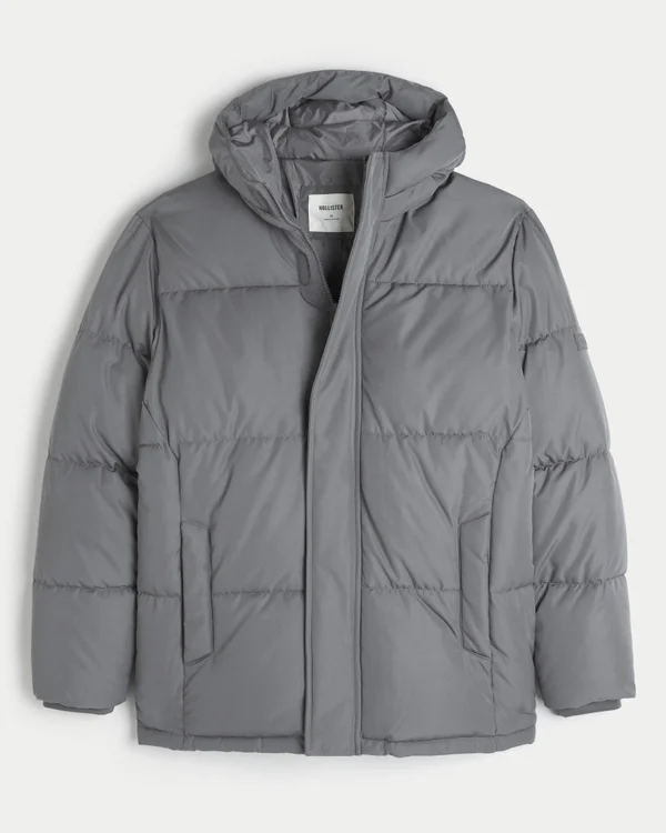 A parka-length puffer jacket designed with wide quilted channels, a full zip-up closure and front pockets. Hood, storm cuffs.