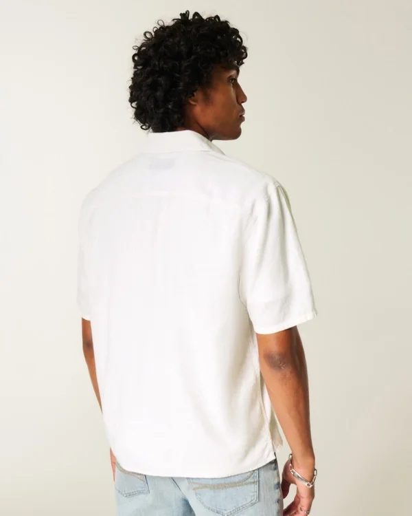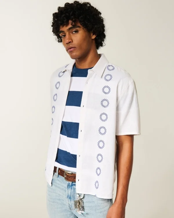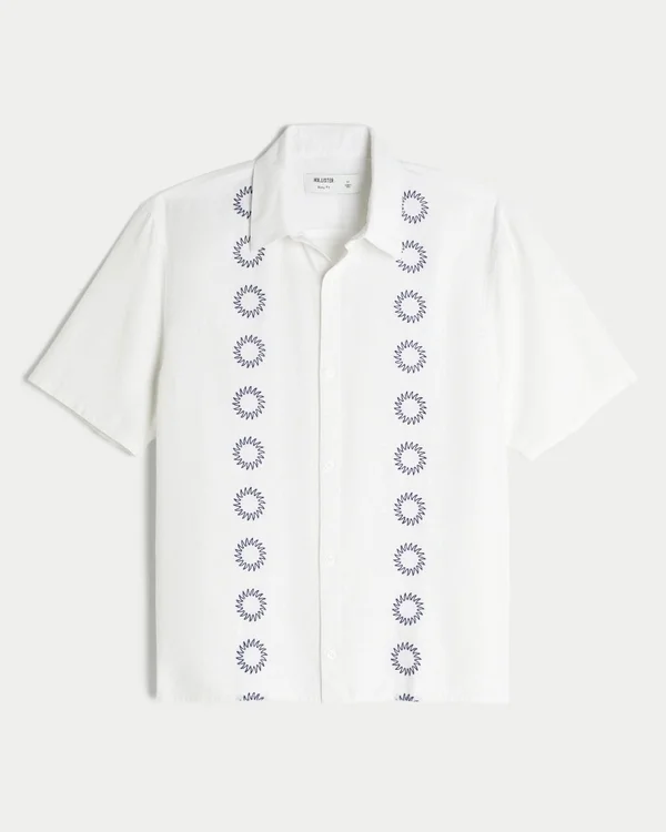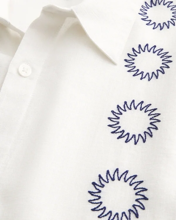 A classic shirt in a soft linen-cotton blend, featuring an embroidered sun pattern. Short sleeves, full button closure, collar. Boxy Fit.