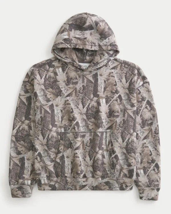 A super soft fleece hoodie featuring an all-over camo pattern. Front pouch pocket, hood, long sleeves. Baggy Cinch Fit.