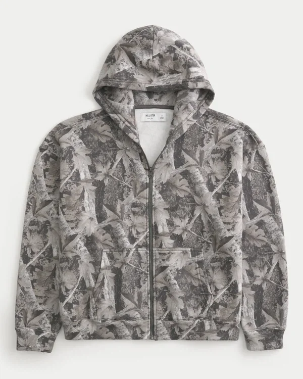 This super soft fleece hoodie features an all-over camo pattern and full zip-up closure. Long sleeves, hood, front pockets. Boxy Fit.