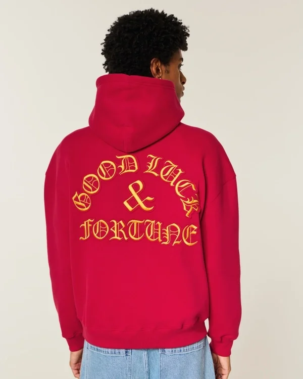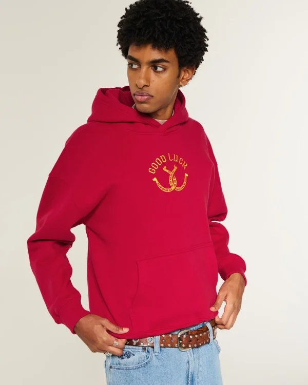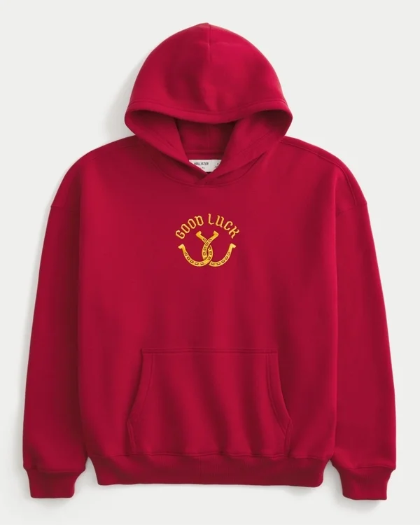 A super soft fleece hoodie featuring Good Luck horseshoe graphic embroidery at the front and Good Luck & Fortune graphic applique at the back. Front pouch pocket, long sleeves, hoo