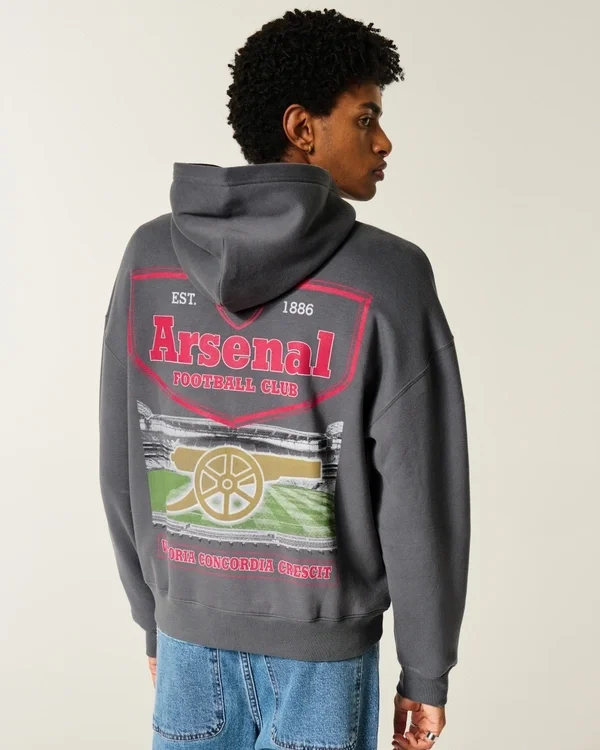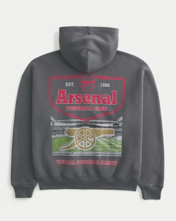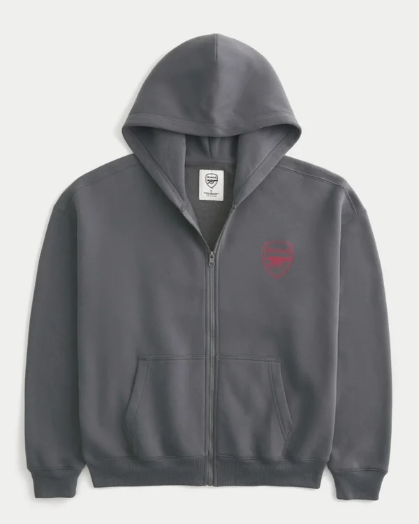 A super soft fleece hoodie featuring official licensed Arsenal F.C. print graphics at the left chest and back. Front pockets, full zip-up closure, long sleeves, hood. Boxy Fit.