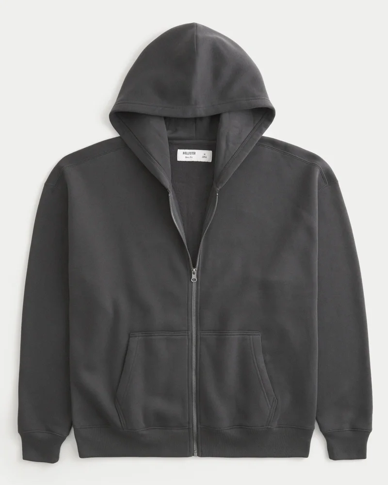 A super soft fleece hoodie with a full zip-up closure and front pockets. Long sleeves, hood. Boxy Fit.