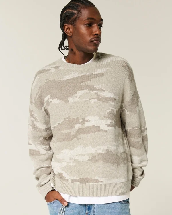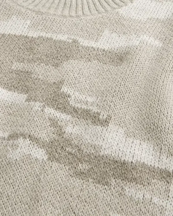 A super soft sweater with an all-over camo intarsia pattern. Crew neckline, long sleeves, ribbed trims. Boxy Fit.