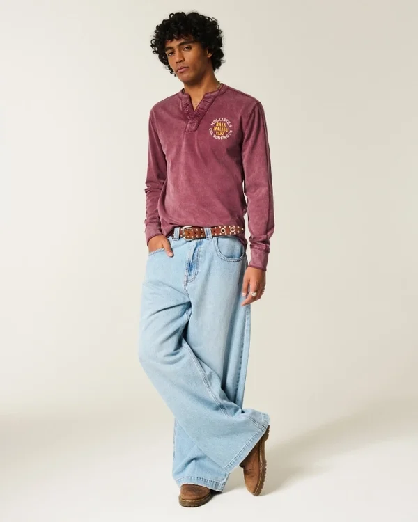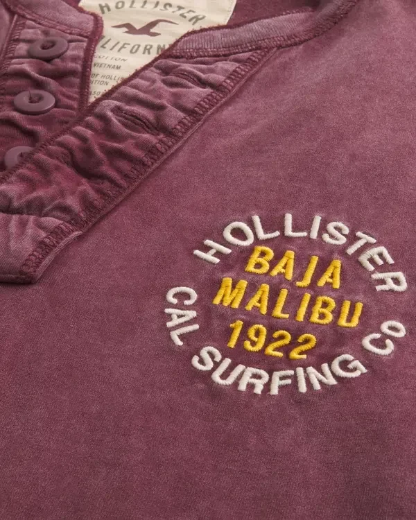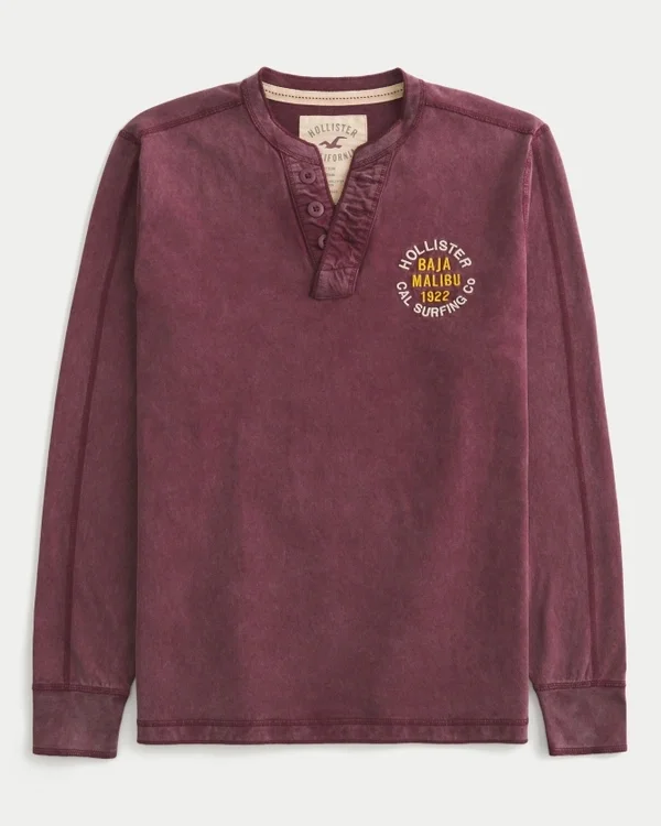 A super soft 100% cotton henley featuring distressed logo graphic embroidery at the left chest. Button placket, washed look, long sleeves.