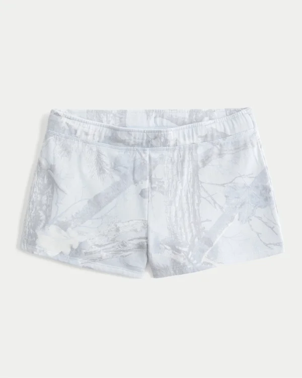 Super soft fleece mini shorts designed with a foldover drawstring waist. All-over blue camo pattern.