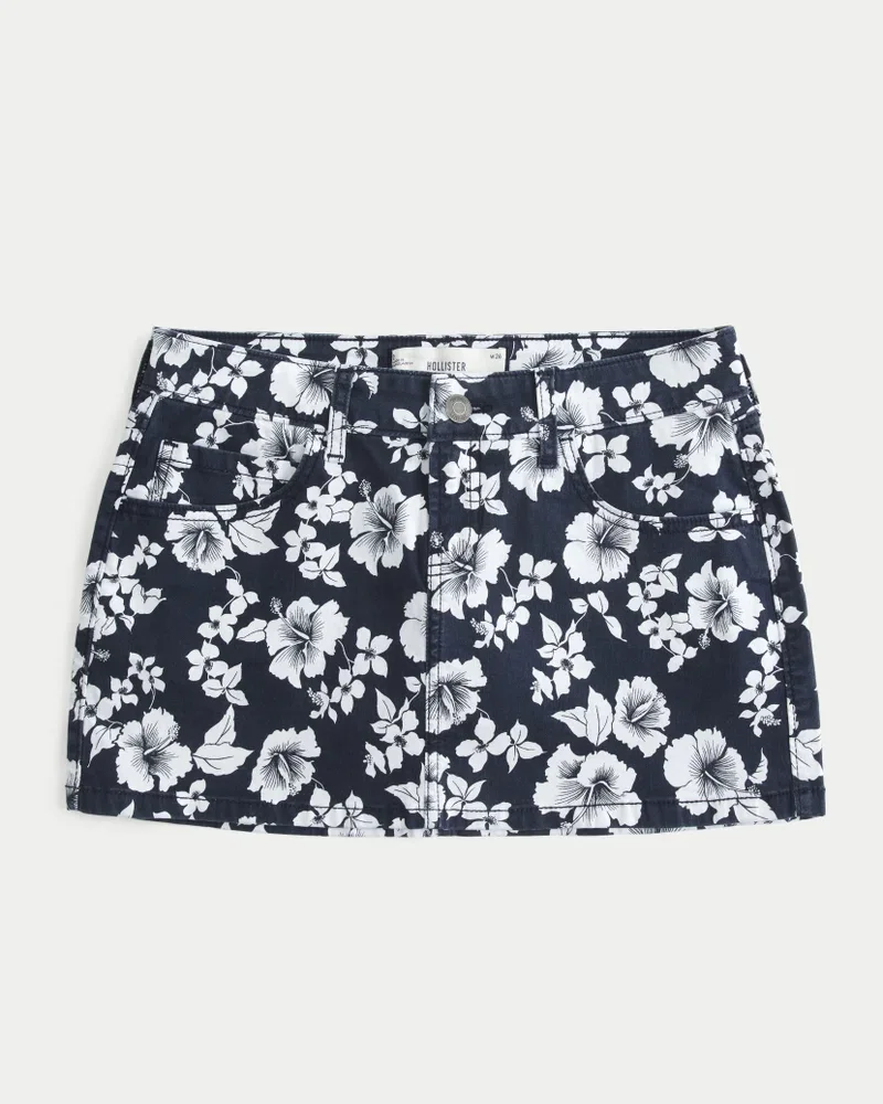 A cute twill mini skort designed with a low-rise waist and hidden knit shorts. Hibiscus floral print.