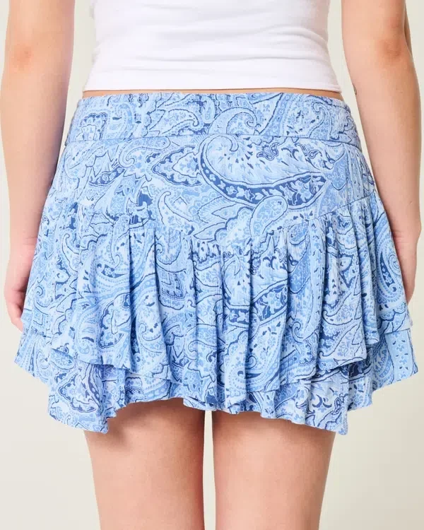 Flowy and super soft, this mini skort is designed with a mid-rise waist and features hidden shorts, pockets, a smocked waistband and asymmetrical hem.