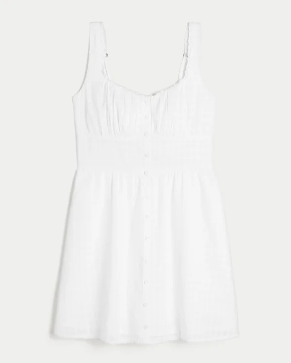 A flowy and super soft mini dress with front button details and lace trim along the neckline.