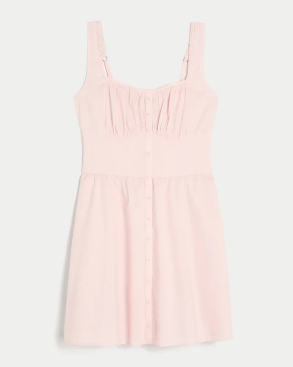 A flowy and super soft mini dress with front button details and lace trim along the neckline.