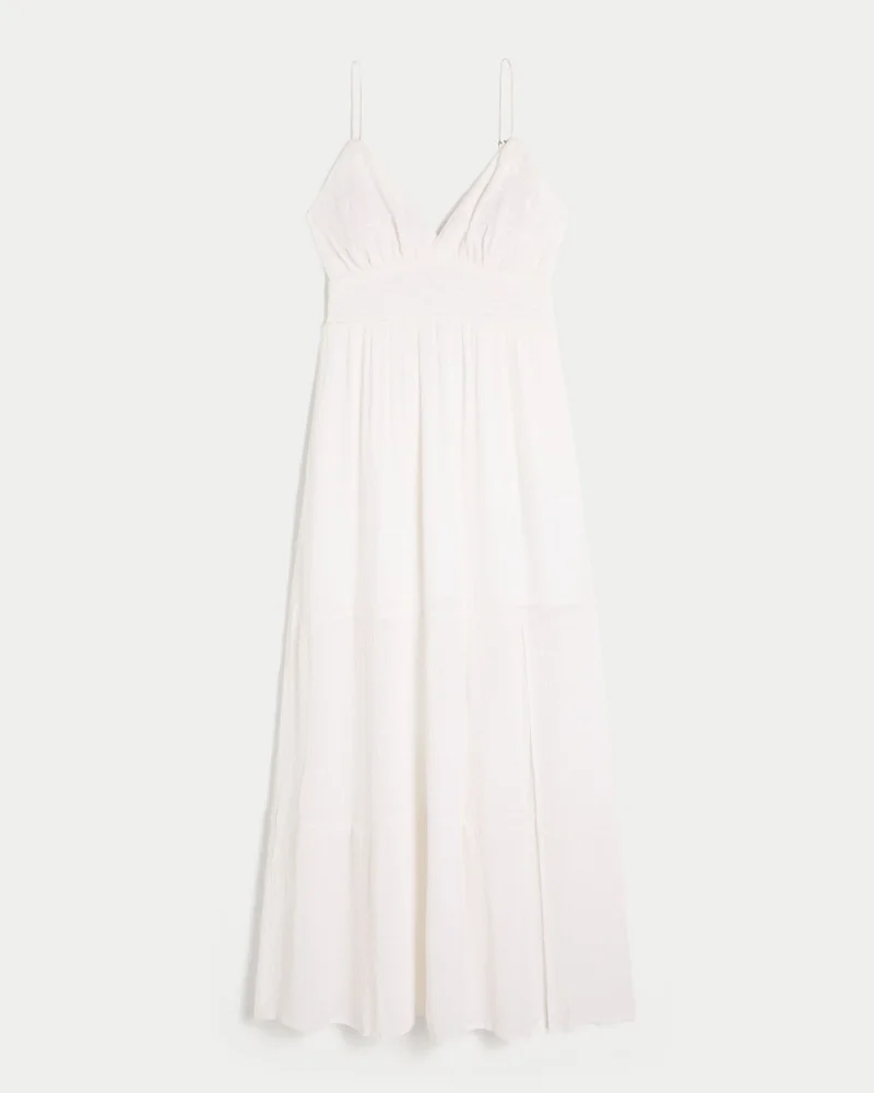 This pretty and super soft maxi-length dress features embroidered details at the bust. Split hem detail, adjustable straps, soft smocked waist.