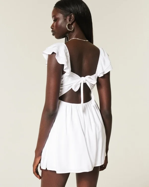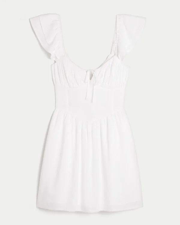 Pretty and super soft, this dress features ruched detailing through the bust, a front tie detail, and double flutter sleeves. Bra-covering back detail, flowy skirt, hidden shorts,