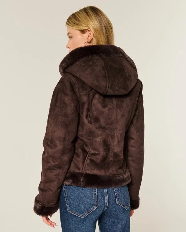 This jacket is made with soft faux shearling fabric and features cozy faux fur lining and trim along the hems. Faux fur-lined hood, front pockets, full zip-up closure.