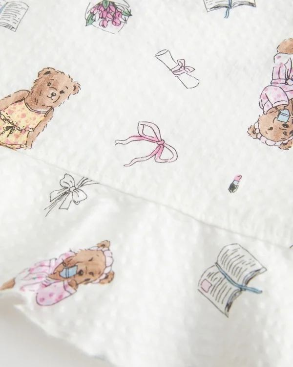 A cute and comfy tank in soft seersucker fabric, featuring an all-over bear graphic pattern and ruffled hem. Adjustable straps.
