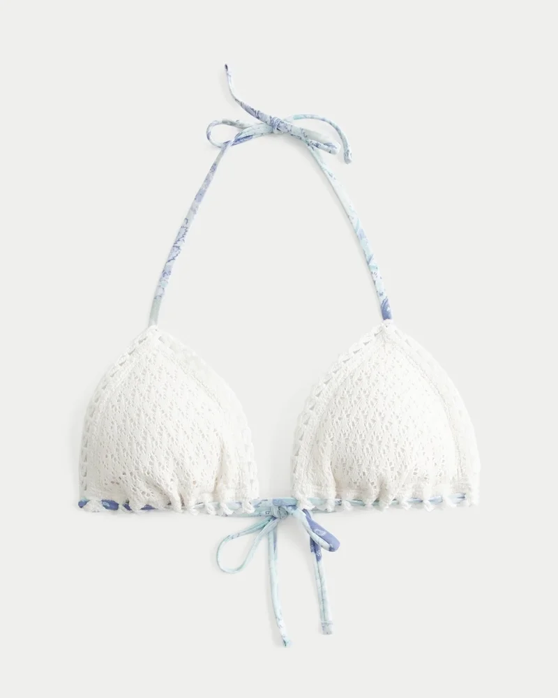 A cute bikini top in soft crochet-style swim fabric, featuring a wrapped bottom tie detail. Tie closure, halter straps, triangle silhouette, removable padding.