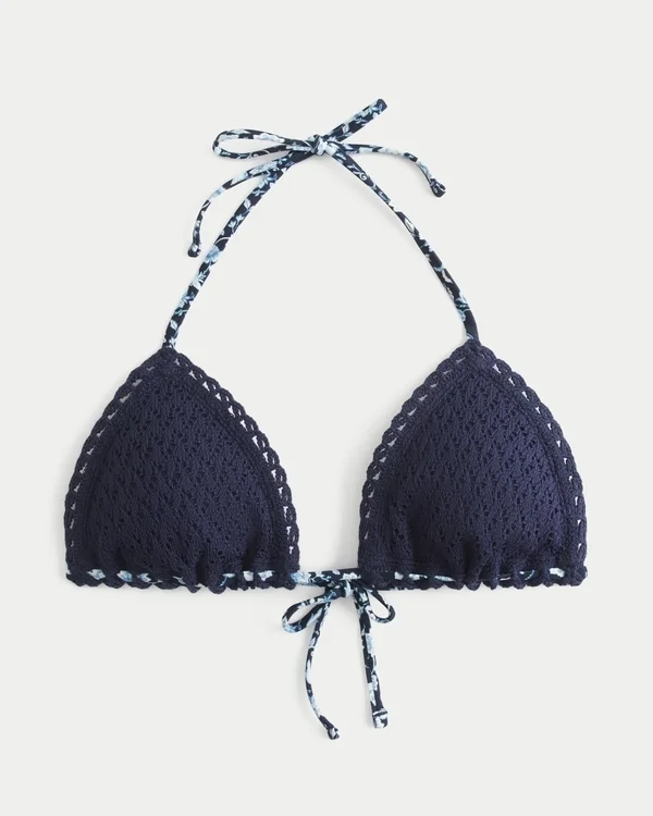 A cute bikini top in soft crochet-style swim fabric, featuring a wrapped bottom tie detail. Tie closure, halter straps, triangle silhouette, removable padding.
