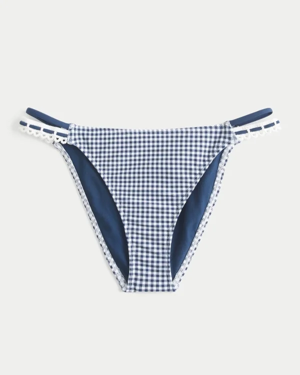 A cute bikini bottom featuring double side straps with crochet-style trim. Cheeky coverage.