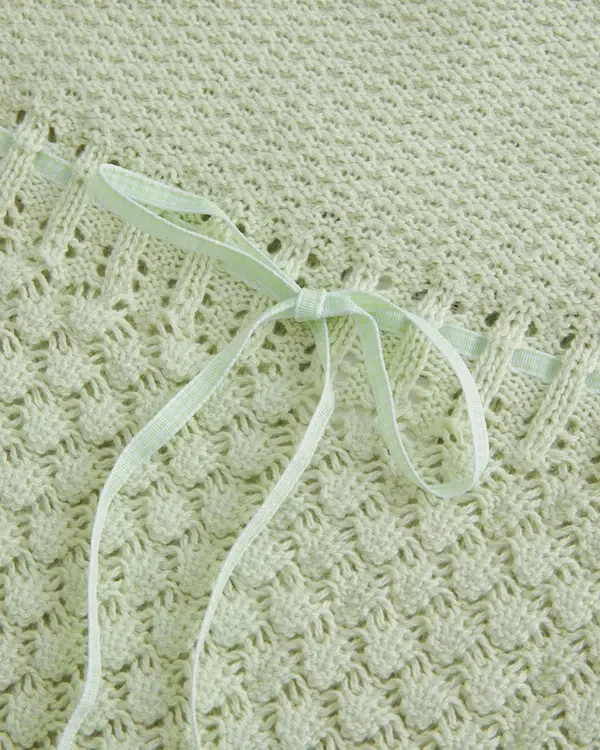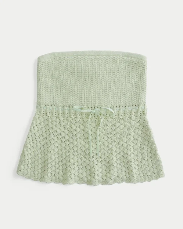 Cozy and super soft, this tube top features crochet-style patterns and a tie detail through the waist. Strapless.