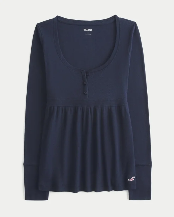 Cute and super soft, this babydoll top features a henley-style button placket and back tie. Long sleeves. Easy Fit.