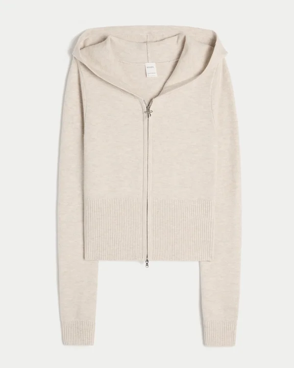 A cozy and super soft sweater hoodie with a dual zipper closure and long sleeves. Ribbed trims.