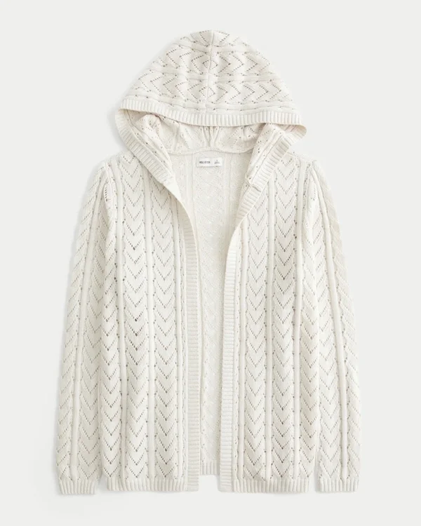 Cozy and super soft, this cardigan features open-stitch patterns and a hood. Long sleeves, ribbed trims, no closure.