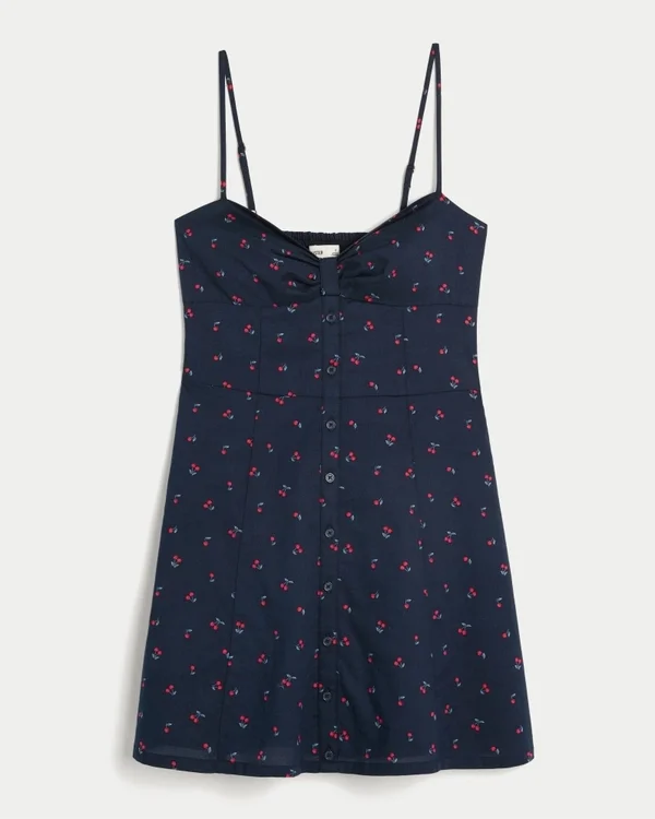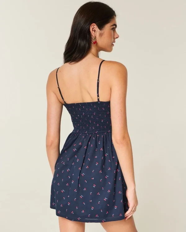 This cute mini dress features a pinched sweetheart neckline, skinny adjustable straps and a soft smocked back. Front button details.