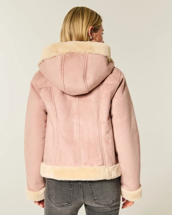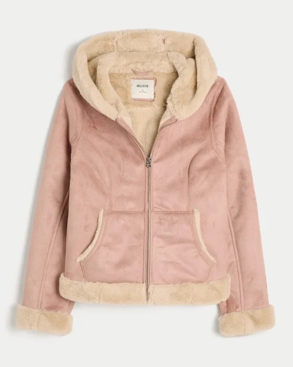 This jacket is made with soft faux shearling fabric and features cozy faux fur lining and trim along the hems. Faux fur-lined hood, front pockets, full zip-up closure.