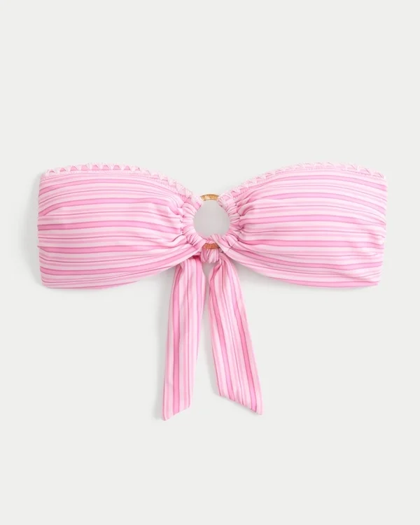 A cute bikini top designed with a bandeau silhouette and center o-ring detail. Stitched trim, removable padding, removable straps, tie back.