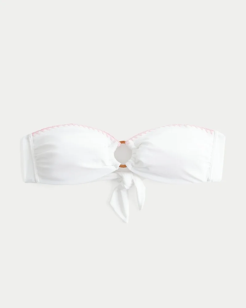A cute bikini top designed with a bandeau silhouette and center o-ring detail. Stitched trim, removable padding, removable straps, tie back.