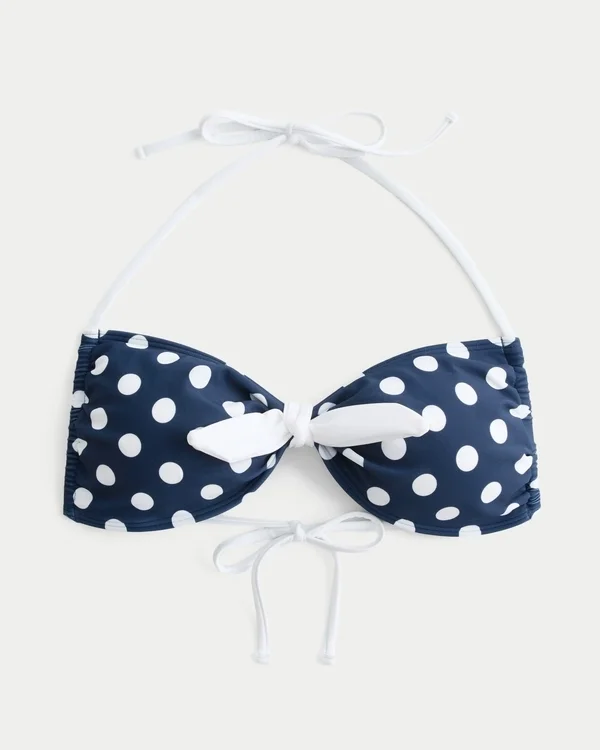 A cute bikini top designed with a bandeau silhouette, featuring a tie front, halter straps, tie back and removable padding. Pattern mixing.